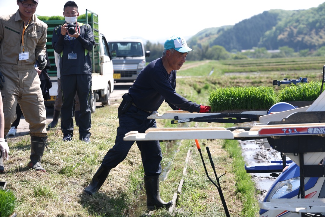 田植え作業は、人の手で苗箱を積み、田植え機で田んぼに苗を植え付けると同時に有機肥料を散布します。