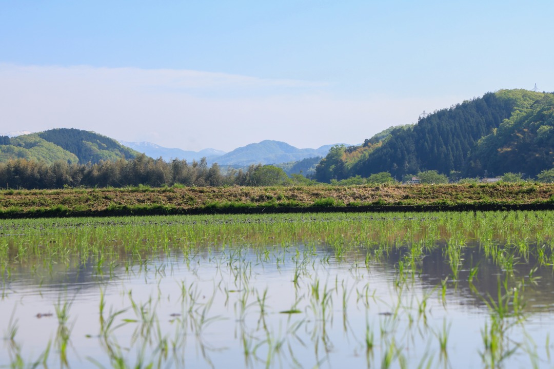 田んぼに植えられた苗は、まだ頼りなげに風に揺れています。