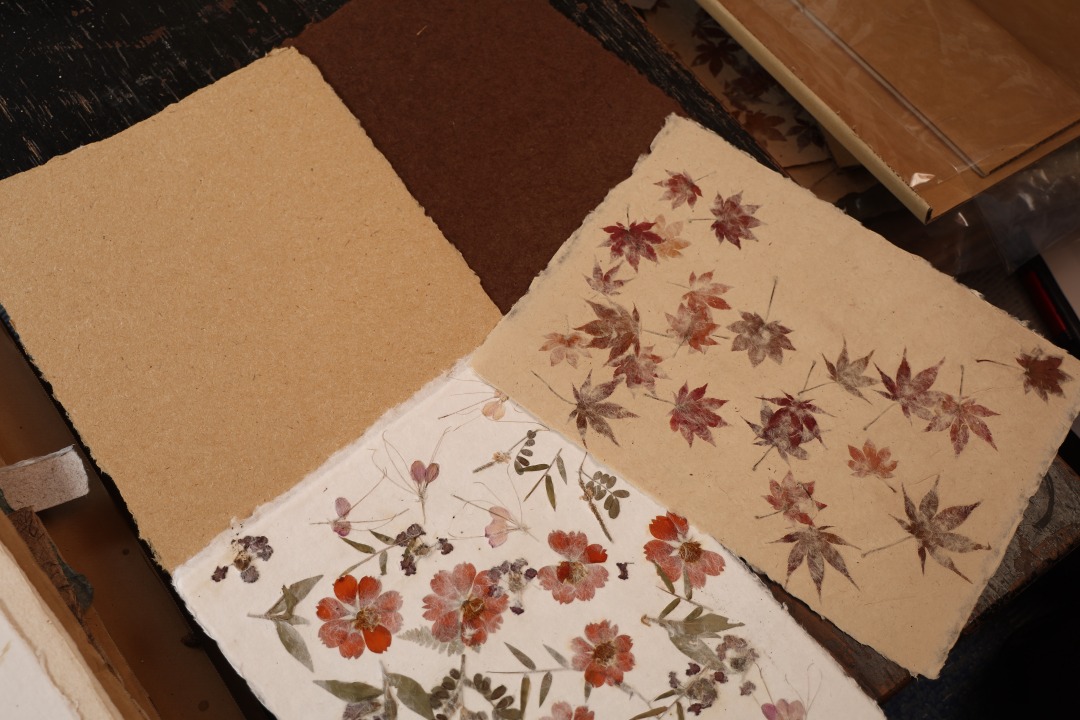 2代目の遠見京美さんの活躍もあり、多彩な植物の種類を使用しただけでなく、野に咲く草花を摘み集めて和紙に漉きこむ「野集紙」という作品シリーズも誕生。まさにこの周辺の風景を紙の中におさめたような、素朴さや穏やかさが作品に表れています。