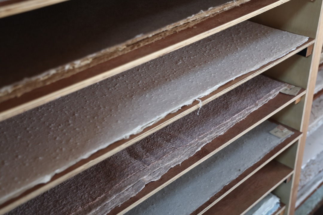 今回使用した輪島の珪藻土は和紙に漉きこむと少し黄みを帯びますが、珠洲の珪藻土になると赤みが強いそうで、能登の中でも地域によって色が若干異なるというのも興味深く感じます。