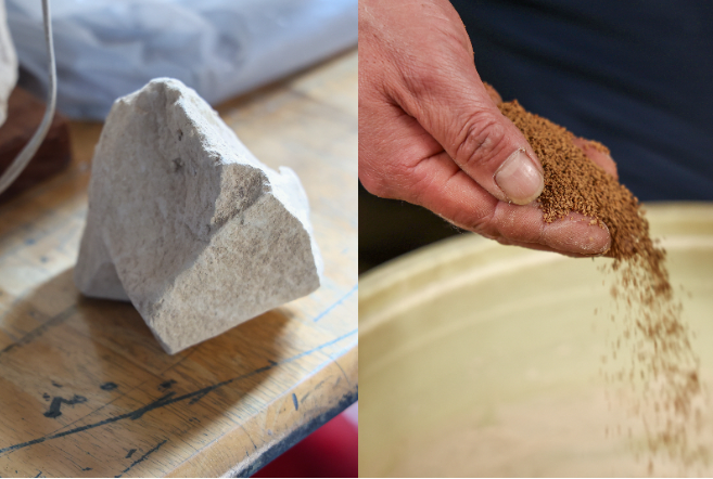 今回のラベルも、珪藻土の粒をどのくらい残すかが難点だったとか。珪藻土のブロックは砕いて粉々にし、擂った砂を水に溶かして粒の大きさを調整するために何度か濾して使うのです。