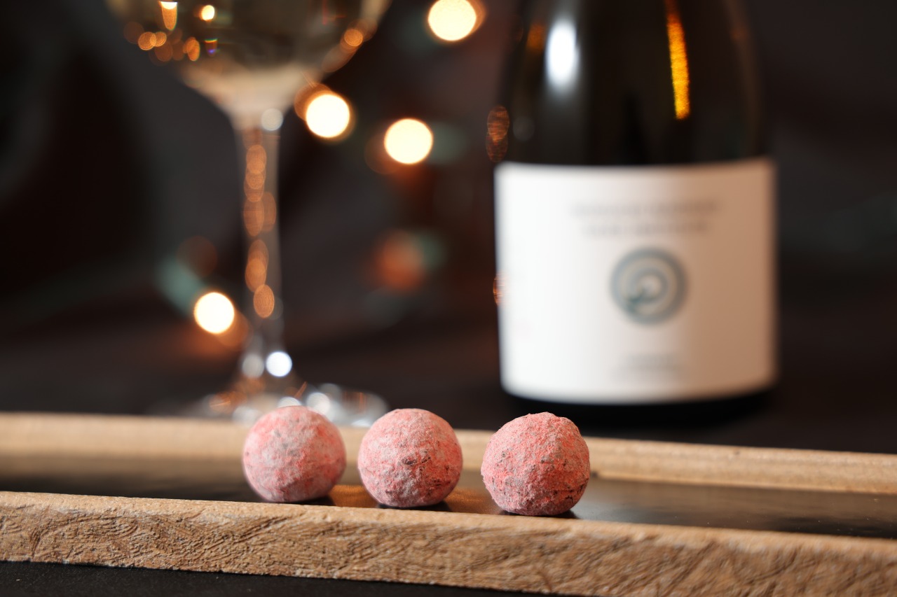 まとった苺パウダーは口に含んだ瞬間の甘酸っぱいフルーツを連想させ、瑞々しい印象を持たせてくれます。口の中でチョコレートが溶けるにつれ、甘みや香味豊かに。凛とした輪郭を持ちながらも、どこか軽やかさのある「山廃美山錦」の日本酒を、ショコラの中で丁寧に組み立てています。
